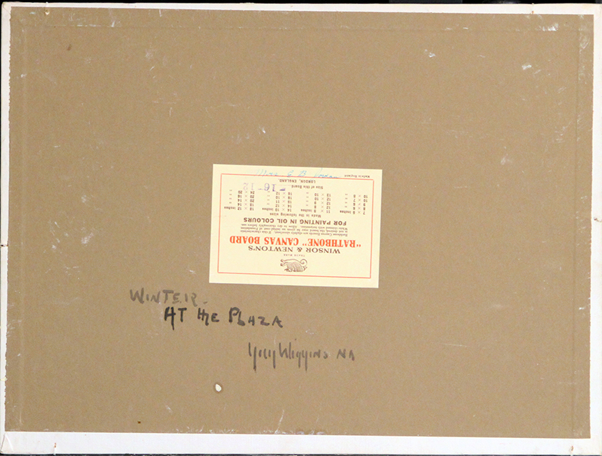 Notes: "Winter at the Plaza" by Guy Carleton Wiggins was painted circa 1940. The painting is signed lower left Guy Wiggins and is signed Guy Wiggins, NA and titled verso. The painting is unlined and in original condition.